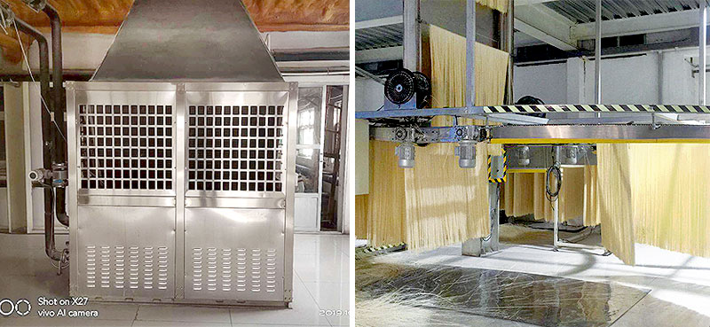 解決(jué)方案:10台25p空氣源熱泵機組(機型:QHDKX(L)S-90II/VC)和10台50P空氣能熱泵機組(型號:QHDKX(L)S-18II/UC)供2條生產線麵條烘幹,節省費用(yòng)30%。