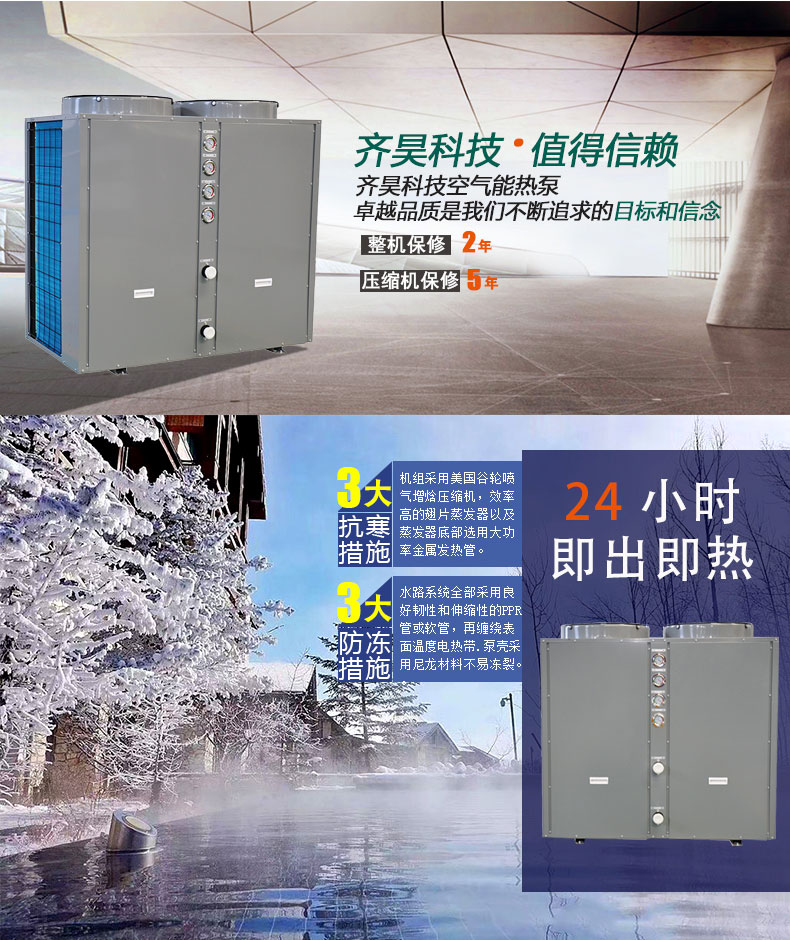 超低溫空氣源熱泵熱水係列機組(zǔ),可實現(xiàn)24小時恒溫供水。17c在线观看超低溫空氣源熱(rè)泵熱(rè)水係列機組采用國際領先水平的(de)噴氣增焓技術,確保了在低溫極寒的環境溫度下機組也能穩定可靠的運行。機組(zǔ)采用(yòng)智能除霜技(jì)術,化霜時間大大縮減,能效不衰減。機組零部件均采用國際一流品牌,安全可靠,使用壽命長達(dá)15年以上。