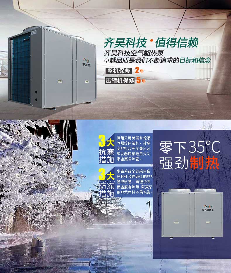 齊(qí)昊(hào)超低(dī)溫空氣源熱(rè)泵冷暖係列機組具有高效、低噪音、結(jié)構合理、操作簡便、運行安全、安裝維護方便(biàn)等優點,廣泛應用於酒店、賓館、商場、辦公樓、展(zhǎn)覽館、機場、體育館等公共場所,並能滿足不(bú)同行業對空調係統的不同使用要求。