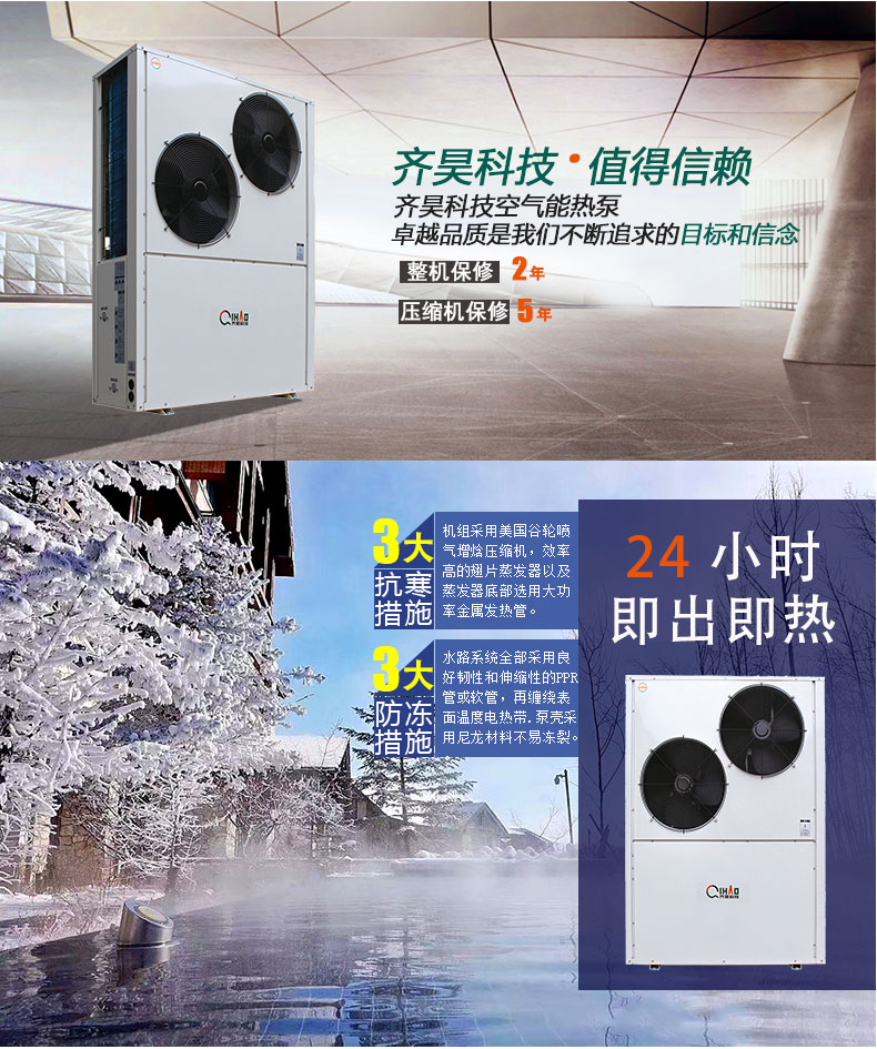 超低溫空氣(qì)源熱泵熱水係列機組,可實現24小時恒溫供水。17c在线观看超低溫空氣源熱泵熱(rè)水係列機組采用國際領先水(shuǐ)平的噴氣增焓技術,確保了在低溫極寒的環境溫度下機(jī)組也能穩定可靠的運行。機組采用智能除霜技術,化霜時間大大(dà)縮減,能效不衰減。機(jī)組零部件均采用國際一(yī)流品(pǐn)牌,安全可靠,使用壽命長達15年以上。